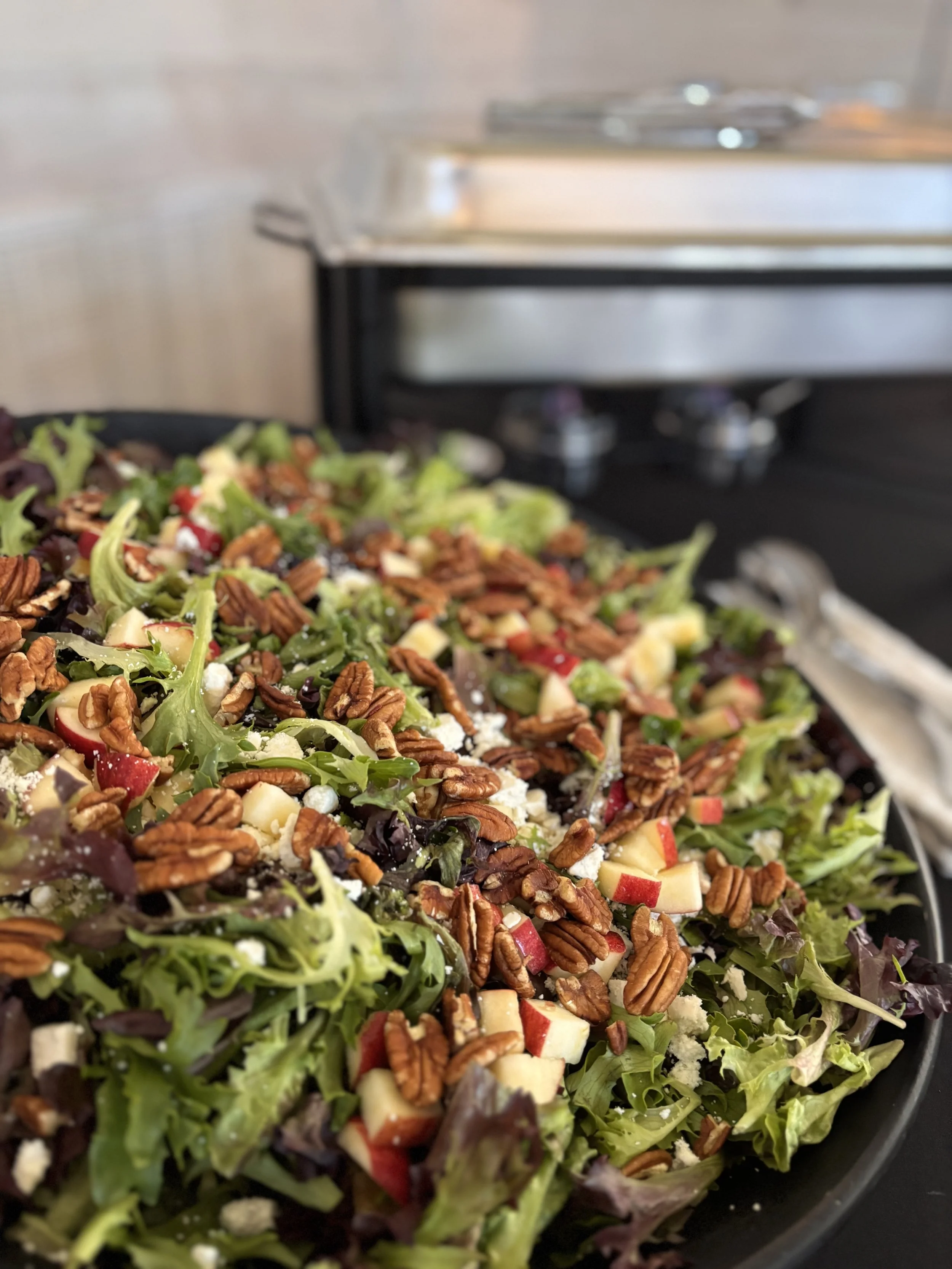 Apple Harvest Salad(GF) – A bed of spring mix lettuce topped with apple slices, feta cheese, and roasted pecans with a maple vinaigrette.